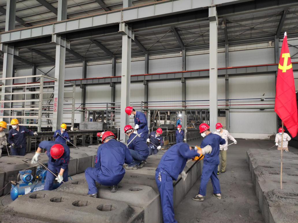 為充分發揮黨員先鋒模范作用,弘揚奉獻精神,近日,陽極分公司為解決焙燒陽極熟塊填充料粘結嚴重、外觀清理速度慢、影響生產進度的問題,陽極分公司黨總支結合生產實際,組織開展了陽極熟塊清焦義務勞動主題黨日活動。活動自從7月21日至24日歷時四天,共計102名黨員干部、管理人員參與了此次活動。 活動中,各支部黨員職工積極踴躍、爭先恐后,按照分工任務計劃和清焦要求,大家分工協作、相互配合,對陽極熟塊表面粘接的焦粒及炭碗進行了清理,勞動現場熱火朝天,一片繁忙。經過四天的奮戰,共清理陽極熟塊208塊,極大的緩解了焙燒塊清焦難題,有效保障焙燒車間生產速度和任務量。 通過此次活動的開展,充分發揮了廣大黨員勇于擔當、甘于奉獻的精神,進一步增強了黨組織的凝聚力和戰斗力,展示了陽極分公司黨員職工團結一致的良好風貌。 |